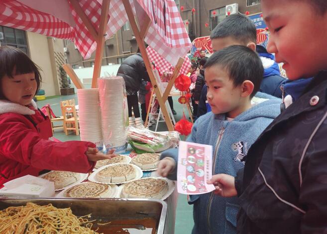 廟會(huì)當(dāng)天,孩子們穿上喜愛的衣服,在會(huì)場中穿梭,品味鹽亭美食——火燒饃、涼粉、涼面等,玩民間游戲——套圈、投壺,再一起做花燈、寫福字、掛祈愿帶,希望來年的自己健健康康。