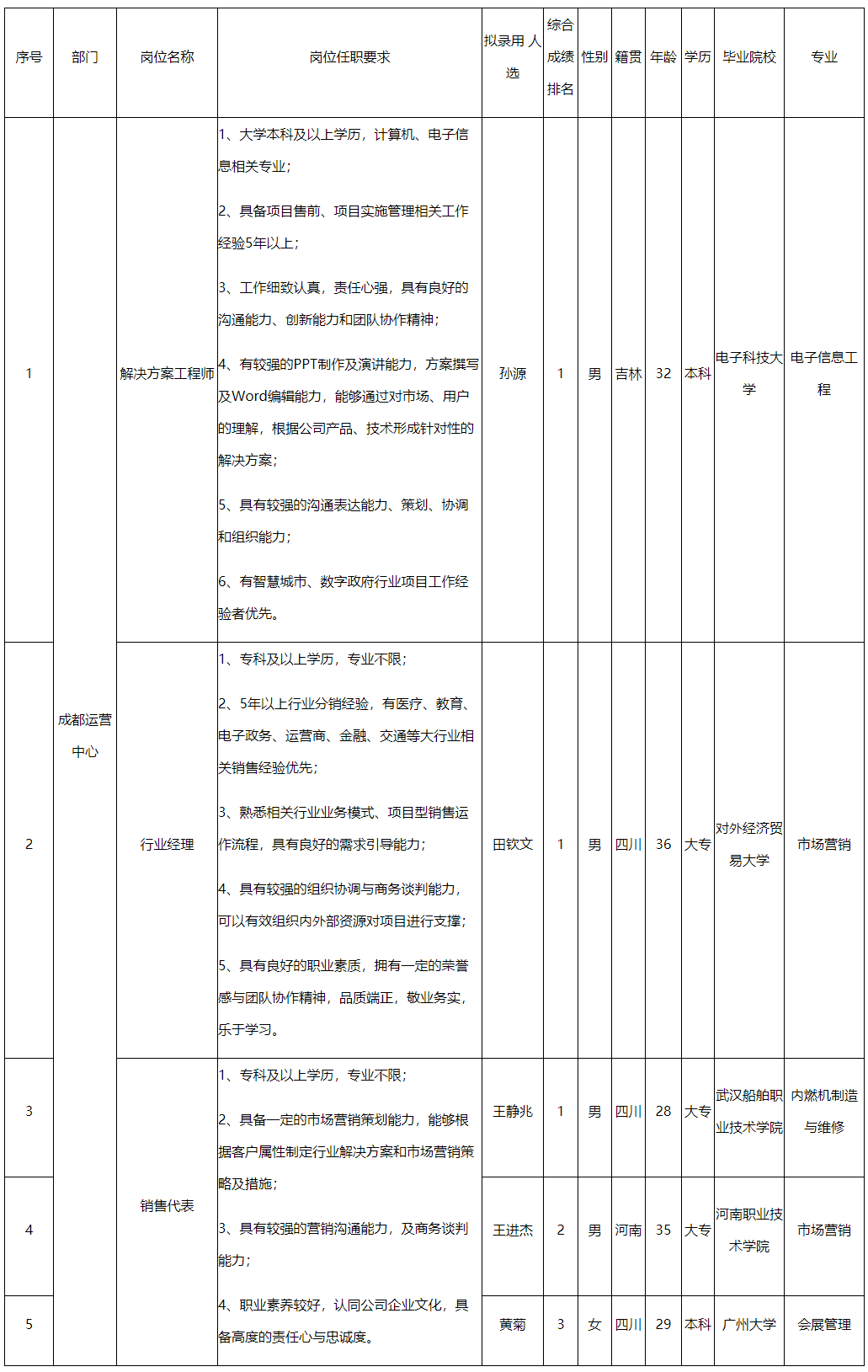 根據(jù)四川科瑞軟件有限責(zé)任公司發(fā)布的招聘公告及招聘相關(guān)規(guī)定,經(jīng)筆試、面試、考察、體檢等程序,擬錄用孫源等5名同志到四川科瑞軟件有限責(zé)任公司工作,現(xiàn)予以公示,具體情況如下: