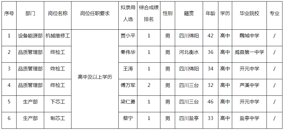 根據(jù)四川波鴻實(shí)業(yè)有限公司發(fā)布的招聘公告及招聘相關(guān)規(guī)定,經(jīng)面試、體檢等程序,擬錄用以下人員到四川綿陽好圣汽車零部件制造有限公司工作,現(xiàn)予以公示,具體情況如下: