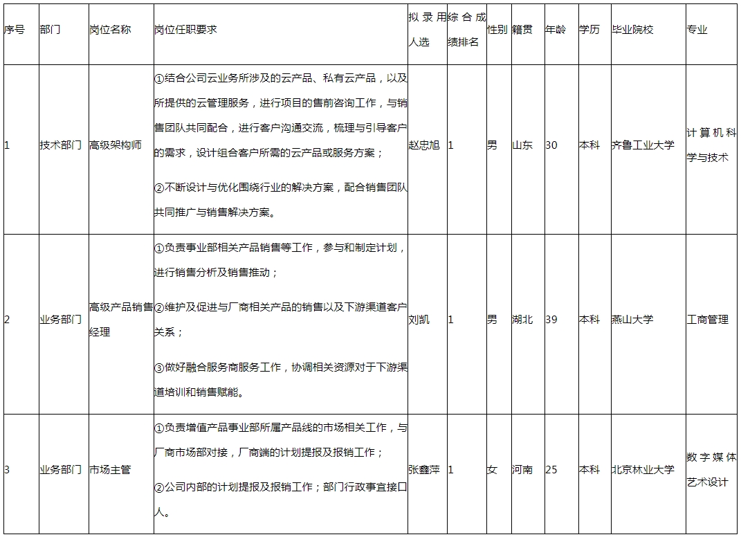 根據(jù)四川長虹佳華信息產(chǎn)品有限責(zé)任公司發(fā)布的招聘公告及招聘相關(guān)規(guī)定,經(jīng)筆試、面試、考察、體檢等程序,擬錄用趙忠旭、劉凱、張鑫萍同志到四川長虹佳華信息產(chǎn)品有限責(zé)任公司工作,現(xiàn)予以公示,具體情況如下: