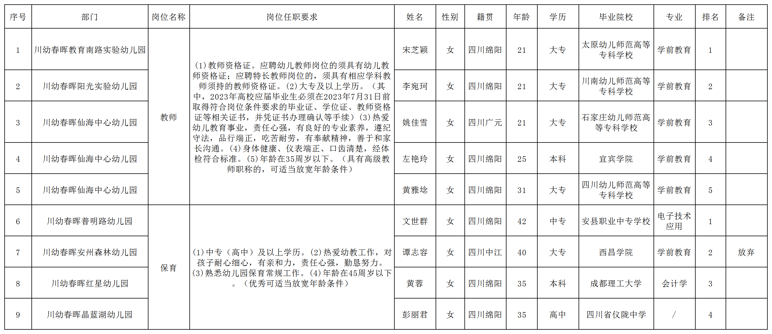 根據(jù)四川川幼春暉學(xué)前教育管理有限公司發(fā)布的招聘公告及招聘相關(guān)規(guī)定,經(jīng)筆試、面試、考察、體檢等程序,擬錄用宋芝穎、李宛珂等8名同志到川幼春暉旗下幼兒園工作,現(xiàn)予以公示,具體情況如下: