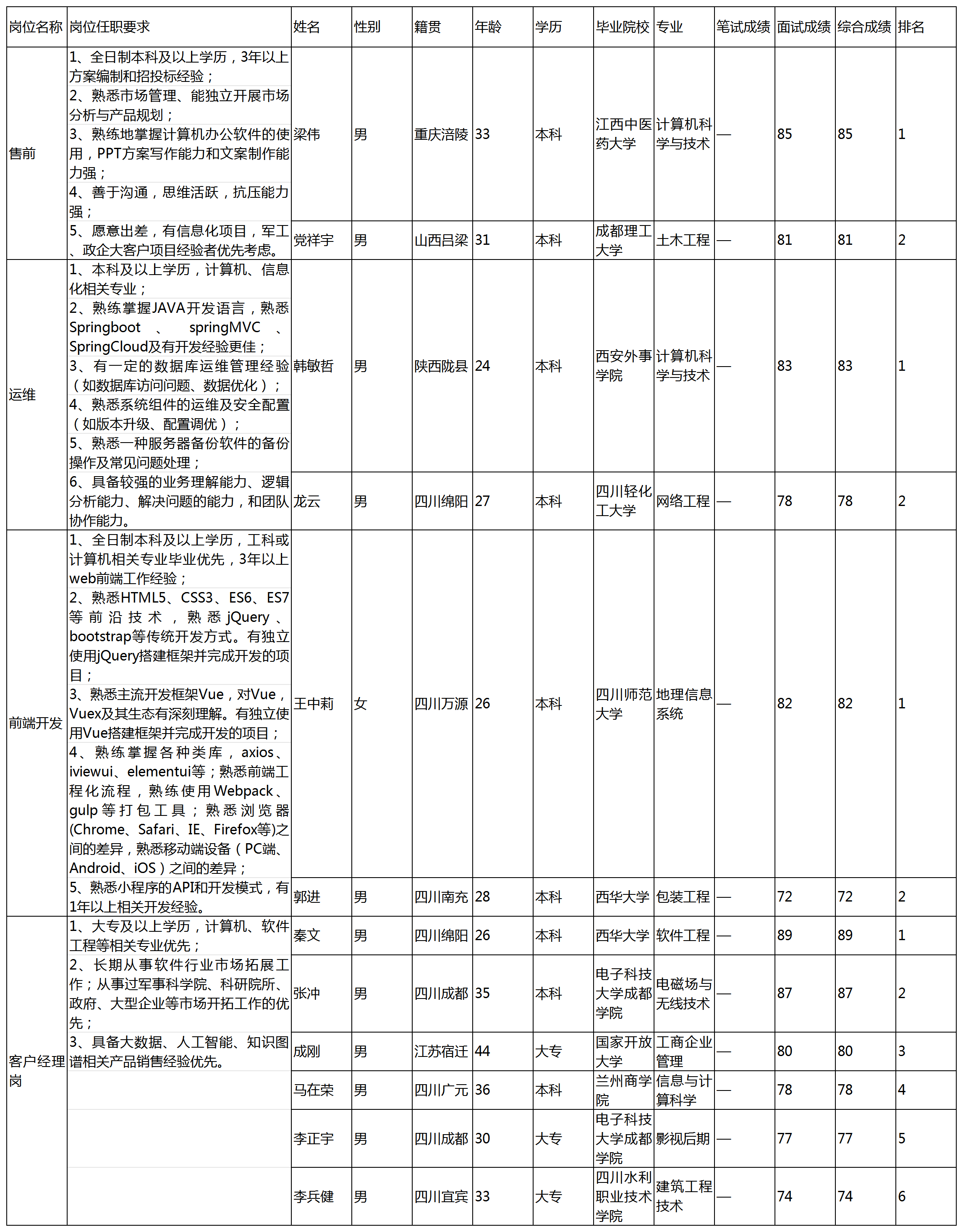 根據(jù)四川九洲軟件有限公司發(fā)布的招聘公告及招聘相關(guān)規(guī)定,經(jīng)筆試、面試等程序,現(xiàn)將筆試(面試)成績予以公示。