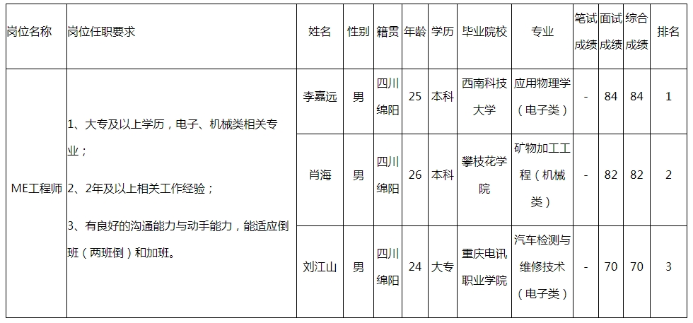 根據(jù)四川九州電子科技股份有限公司發(fā)布的招聘公告及招聘相關(guān)規(guī)定,經(jīng)筆試、面試等程序,現(xiàn)將筆試(面試)成績予以公示。