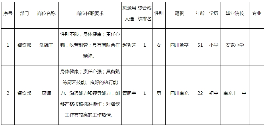 根據(jù)四川長虹國際酒店有限責任公司發(fā)布的招聘公告及招聘相關(guān)規(guī)定,經(jīng)筆試、面試、考察、體檢等程序,擬錄用趙秀芳、青明宇兩名同志到長虹國際酒店工作,現(xiàn)予以公示,具體情況如下: