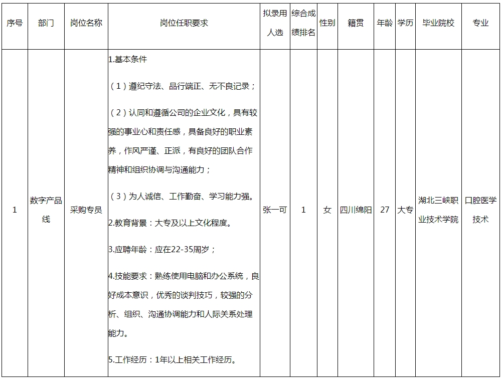 根據四川九州光電子技術有限公司發(fā)布的招聘公告及招聘相關規(guī)定,經面試、考察、體檢等程序,擬錄用張一可同志到四川九州光電子技術有限公司工作,現予以公示,具體情況如下: