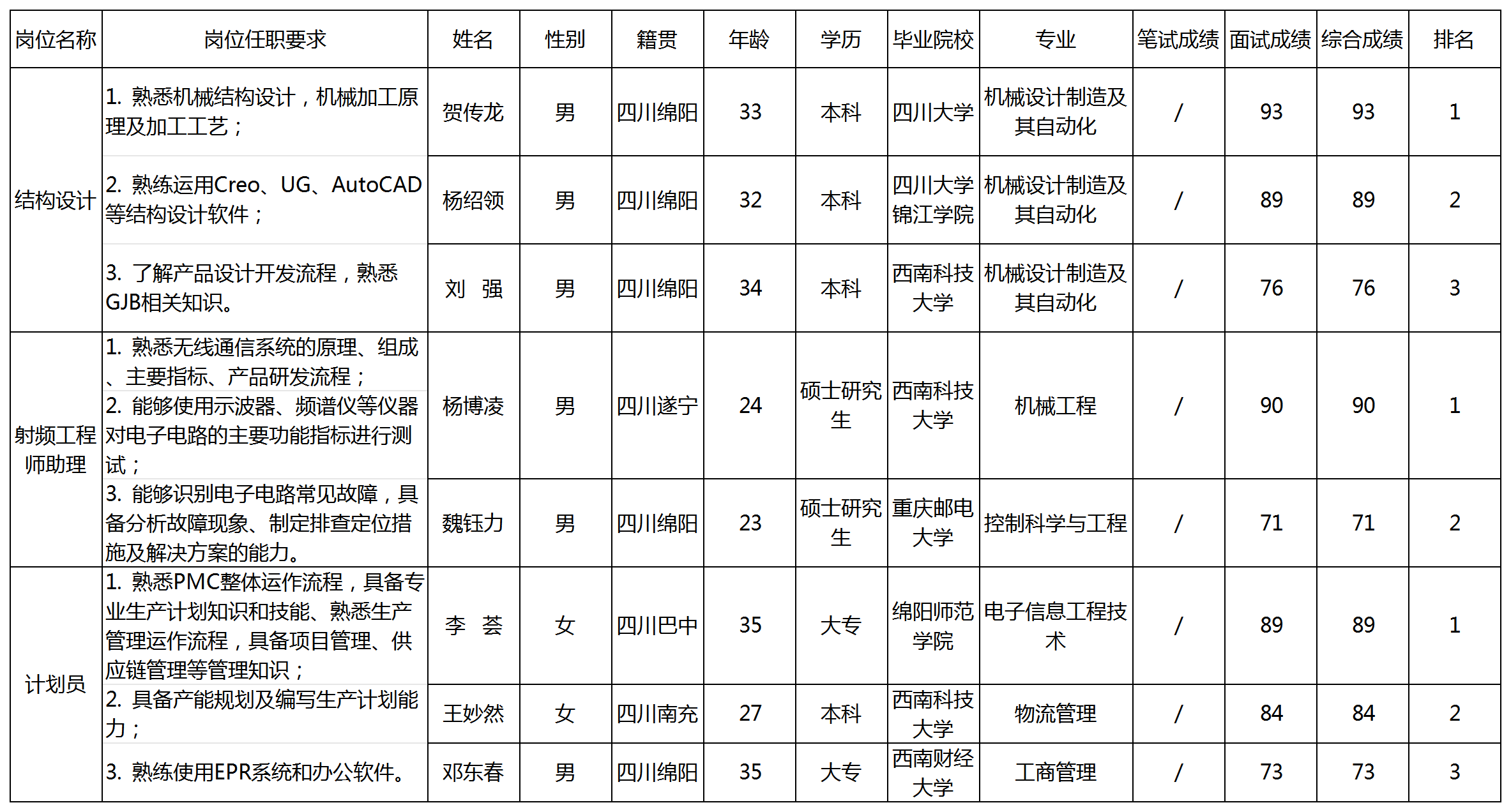 根據(jù)四川九強(qiáng)通信科技有限公司發(fā)布的招聘公告及招聘相關(guān)規(guī)定,經(jīng)筆試、面試等程序,現(xiàn)將筆試(面試)成績(jī)予以公示。