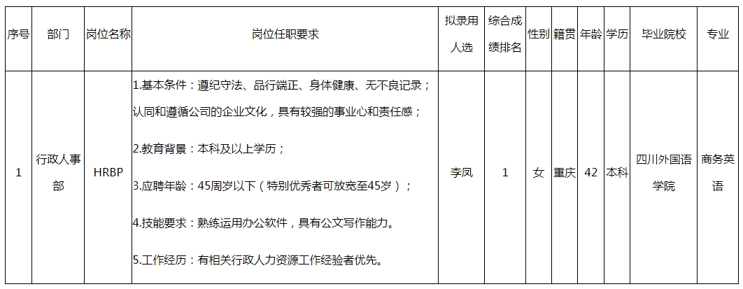 根據(jù)四川長虹空調(diào)有限公司發(fā)布的招聘公告及招聘相關(guān)規(guī)定,經(jīng)面試、考察、體檢等程序,擬錄用李鳳到長虹空調(diào)工作,現(xiàn)予以公示,具體情況如下: