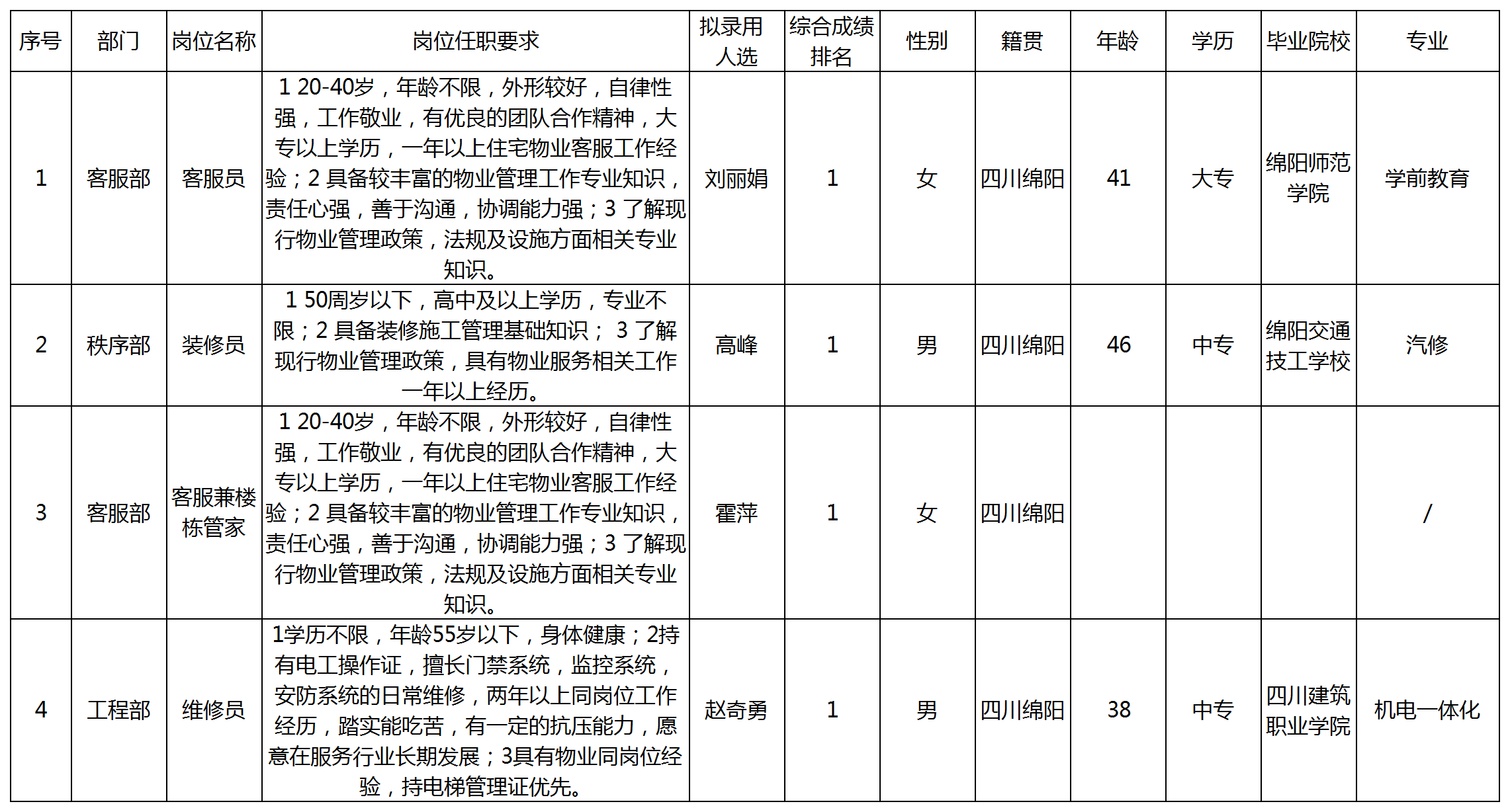 根據(jù)四川長(zhǎng)虹物業(yè)服務(wù)有限責(zé)任公司綿陽(yáng)分公司發(fā)布的招聘公告及招聘相關(guān)規(guī)定,經(jīng)筆試、面試、考察、體檢等程序,擬錄用劉麗娟、高峰、趙奇勇、霍雅薰同志分別到長(zhǎng)虹城南區(qū)、金嶺1號(hào)、國(guó)際城、仙海創(chuàng)新園管理處工作?,F(xiàn)予以公示,具體情況如下: