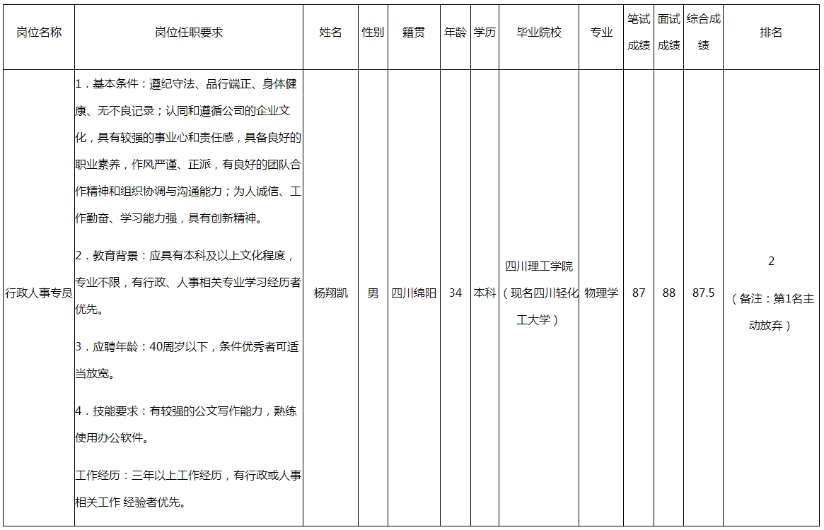 根據(jù)四川長虹電子科技有限公司發(fā)布的招聘公告及招聘相關(guān)規(guī)定,經(jīng)筆試、面試等程序,現(xiàn)將筆試(面試)成績予以公示。
