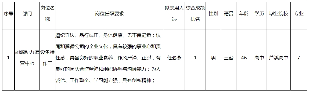 根據(jù)四川長虹電器股份有限公司發(fā)布的招聘公告及招聘相關(guān)規(guī)定,經(jīng)筆試、面試、考察、體檢等程序,擬錄用任必燕同志到能源動(dòng)力運(yùn)營中心工作,現(xiàn)予以公示,具體情況如下: