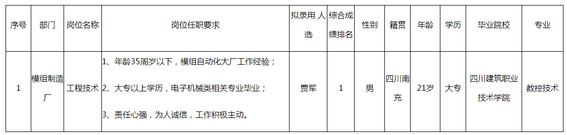 根據(jù)四川愛(ài)聯(lián)科技股份有限公司發(fā)布的招聘公告及招聘相關(guān)規(guī)定,經(jīng)筆試、面試、考察、體檢等程序,擬錄用賈軍同志到模組制造廠任職工程技術(shù),現(xiàn)予以公示,具體情況如下: