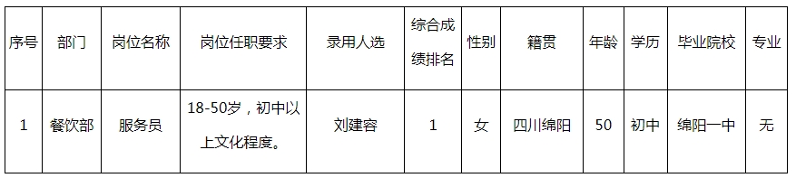 根據(jù)綿陽綿州酒店有限公司發(fā)布的招聘公告及招聘相關(guān)規(guī)定,經(jīng)面試、體檢等程序,錄用劉建容同志到餐飲部工作,現(xiàn)予以公示,具體情況如下: