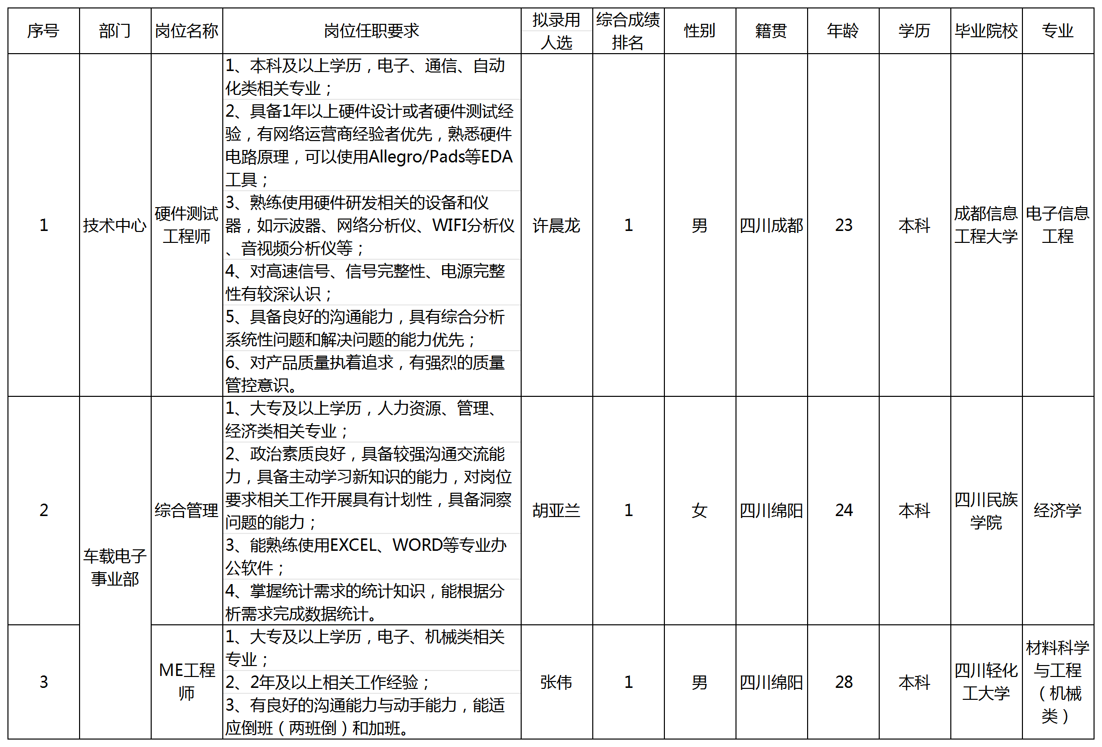 根據(jù)四川九州電子科技股份有限公司發(fā)布的招聘公告及招聘相關(guān)規(guī)定,經(jīng)筆試、面試、考察、體檢等程序,擬錄用許晨龍等3名同志到四川九州電子科技股份有限公司工作,現(xiàn)予以公示,具體情況如下:
