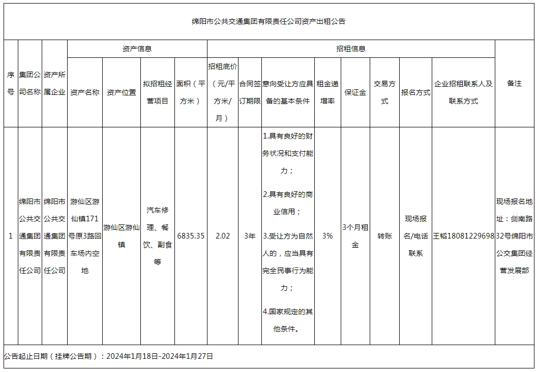 綿陽(yáng)市公共交通集團(tuán)有限責(zé)任公司資產(chǎn)出租公告