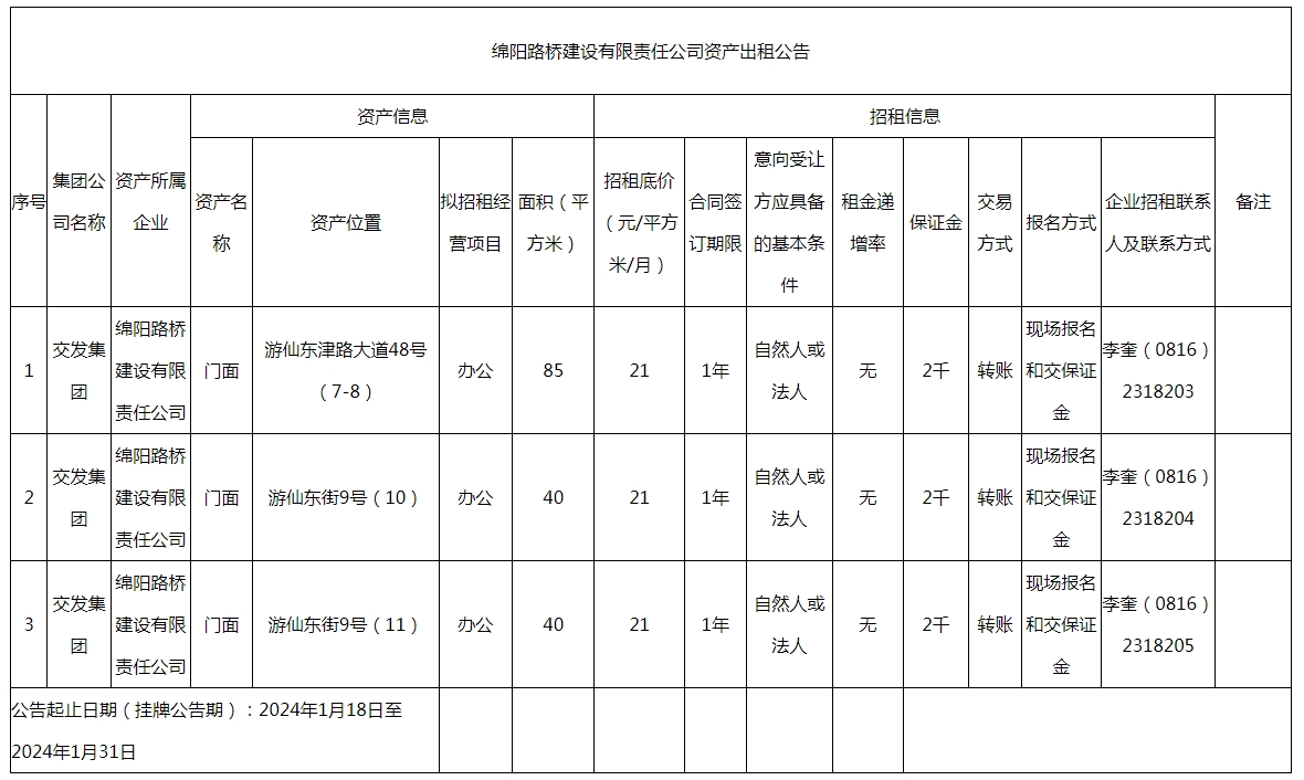 綿陽(yáng)路橋建設(shè)有限責(zé)任公司資產(chǎn)出租公告