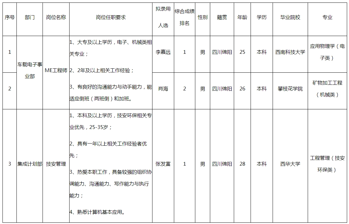 根據(jù)四川九州電子科技股份有限公司發(fā)布的招聘公告及招聘相關(guān)規(guī)定,經(jīng)筆試、面試、考察、體檢等程序,擬錄用李嘉遠(yuǎn)等3名同志到四川九州電子科技股份有限公司工作,現(xiàn)予以公示,具體情況如下: