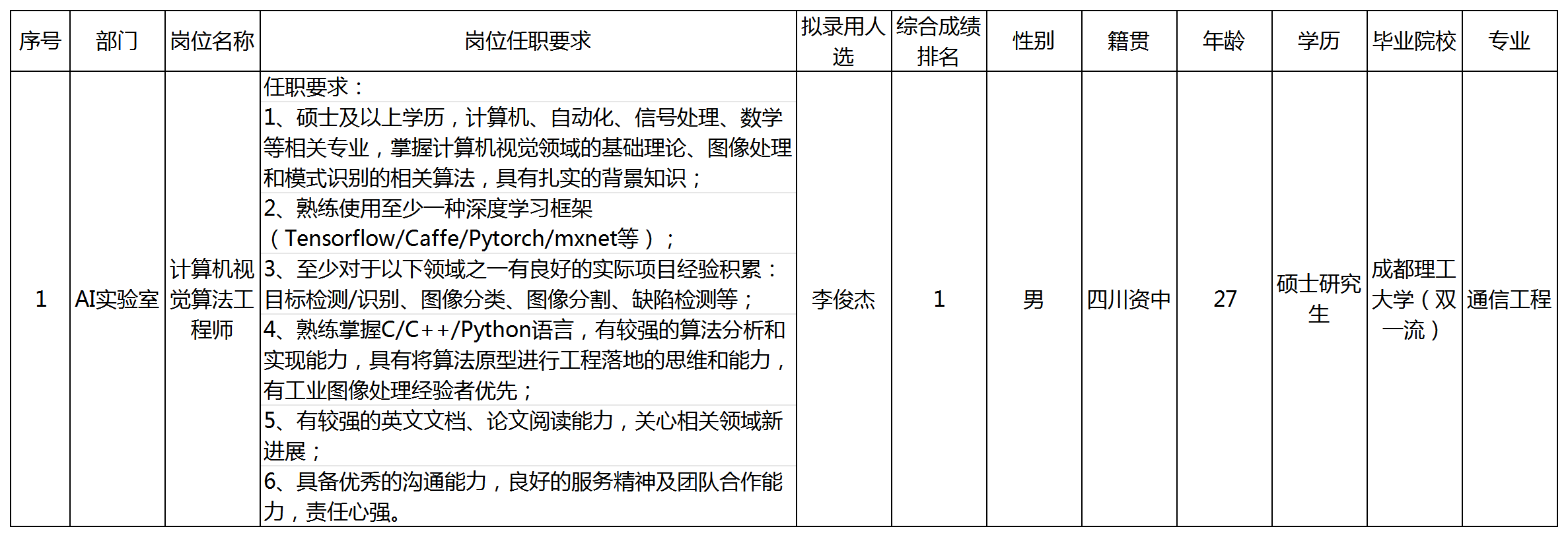 根據(jù)四川啟睿克科技有限公司發(fā)布的招聘公告及招聘相關(guān)規(guī)定,經(jīng)面試、考察、體檢等程序,擬錄用李俊杰同志到公司工作,現(xiàn)予以公示,具體情況如下: