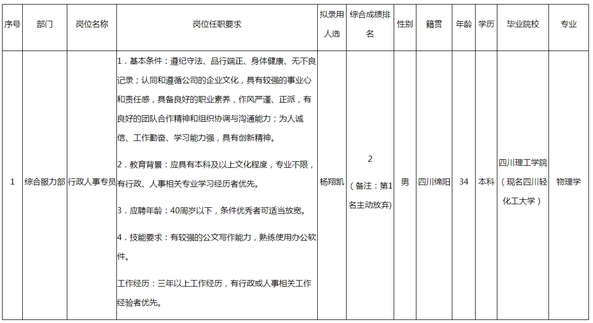 根據(jù)四川長虹電子科技有限公司發(fā)布的招聘公告及招聘相關規(guī)定,經(jīng)筆試、面試、考察、體檢等程序,擬錄用楊翔凱同志到四川長虹電子科技有限公司工作,現(xiàn)予以公示,具體情況如下: