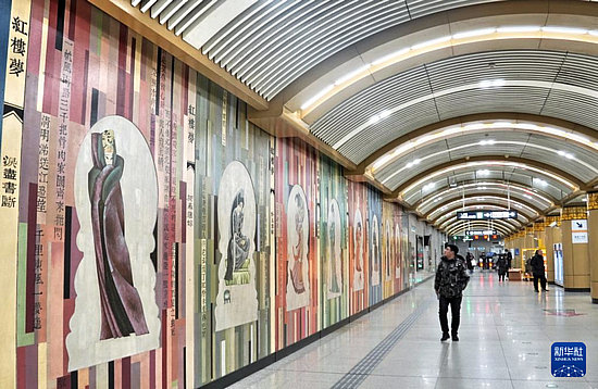 乘客在磁器口地鐵站內(nèi)觀看“紅樓夢(mèng)”壁畫(1月20日攝)。