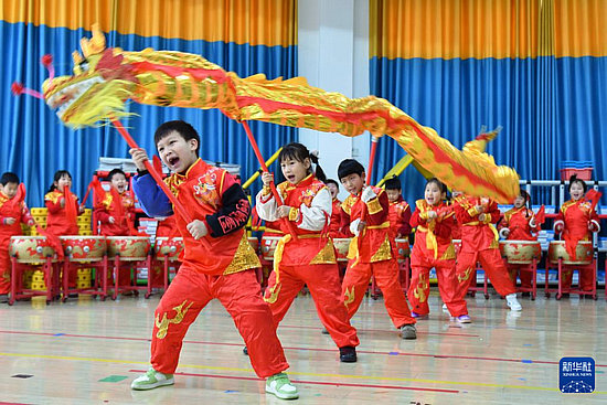 1月19日,山東省煙臺市福山區(qū)實驗幼兒園的小朋友在進行舞龍表演。