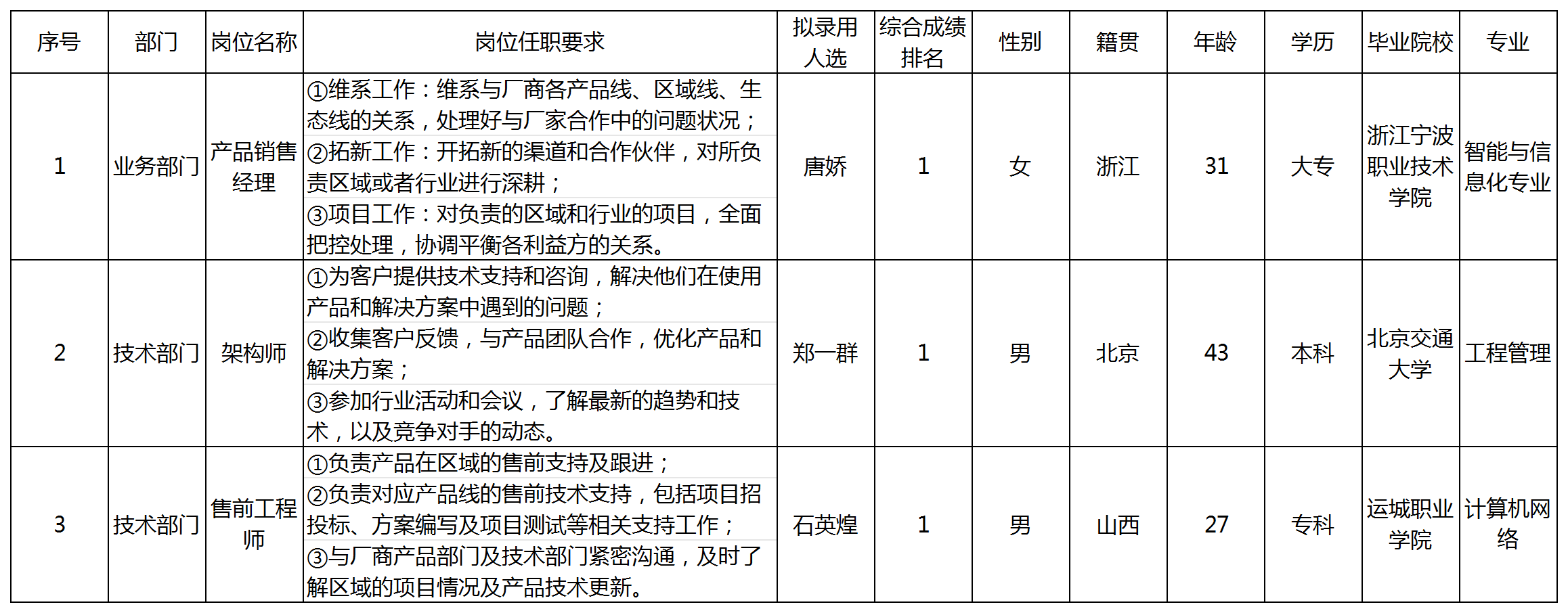 根據四川長虹佳華信息產品有限責任公司發(fā)布的招聘公告及招聘相關規(guī)定,經面試、考察、體檢等程序,擬錄用唐嬌、鄭一群、石英煌同志到四川長虹佳華信息產品有限責任公司工作,現(xiàn)予以公示,具體情況如下: