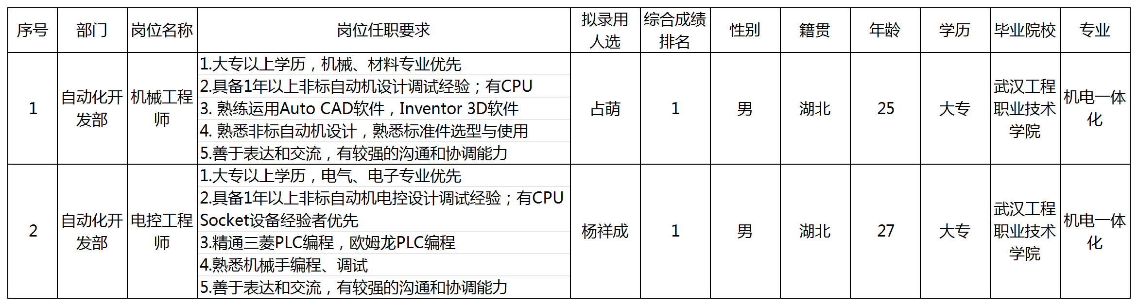 根據(jù)四川華芯鼎泰精密電子有限公司發(fā)布的招聘公告及招聘相關(guān)規(guī)定,經(jīng)筆試、面試、考察、體檢等程序,擬錄用占萌同志等到四川華芯鼎泰精密電子有限公司工作,現(xiàn)予以公示,具體情況如下: