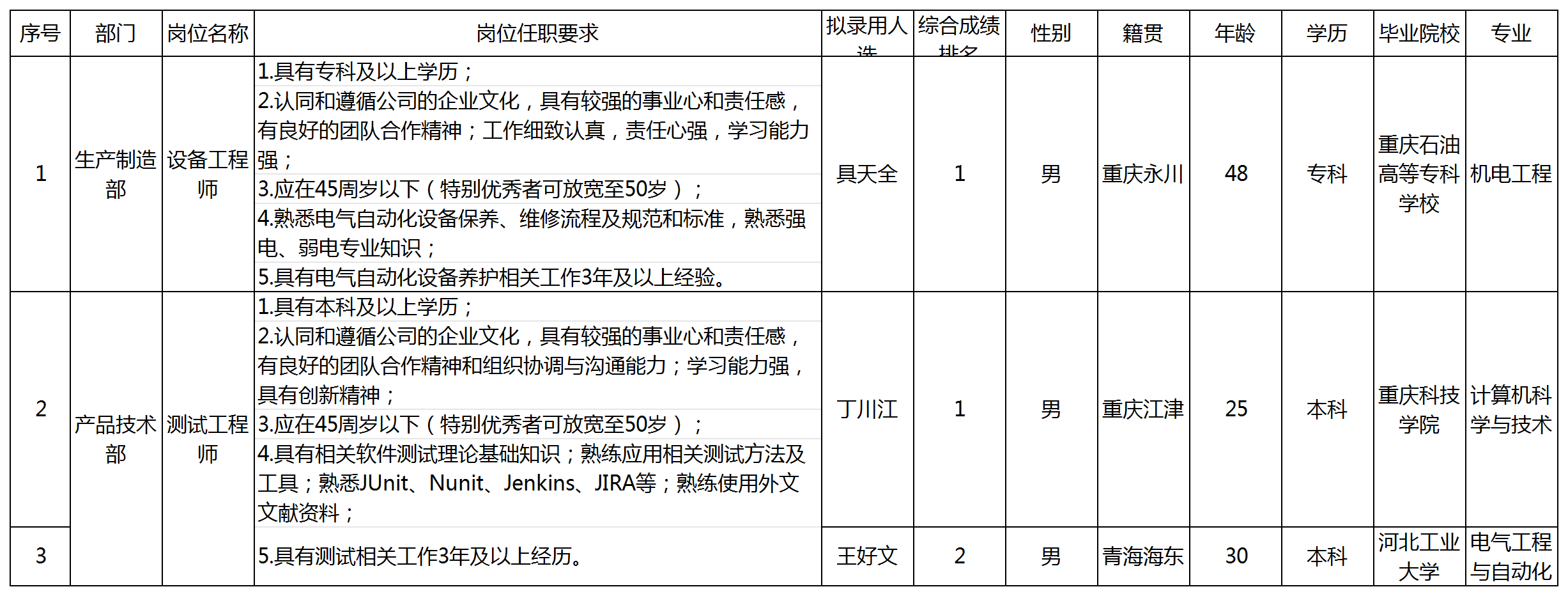 根據(jù)重慶九洲隆瓴科技有限公司發(fā)布的招聘公告及招聘相關(guān)規(guī)定,經(jīng)筆試、面試、考察、體檢等程序,擬錄用具天全、丁川江、王好文同志到重慶九洲隆瓴科技有限公司工作,現(xiàn)予以公示,具體情況如下:
