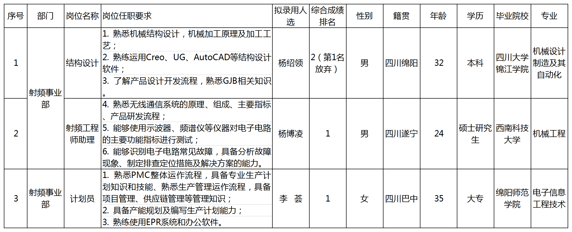 根據(jù)四川九強(qiáng)通信科技有限公司發(fā)布的招聘公告及招聘相關(guān)規(guī)定,經(jīng)筆試、面試、考察、體檢等程序,擬錄用楊紹領(lǐng)、楊博凌、李薈3位同志到四川九強(qiáng)通信科技有限公司工作,現(xiàn)予以公示,具體情況如下: