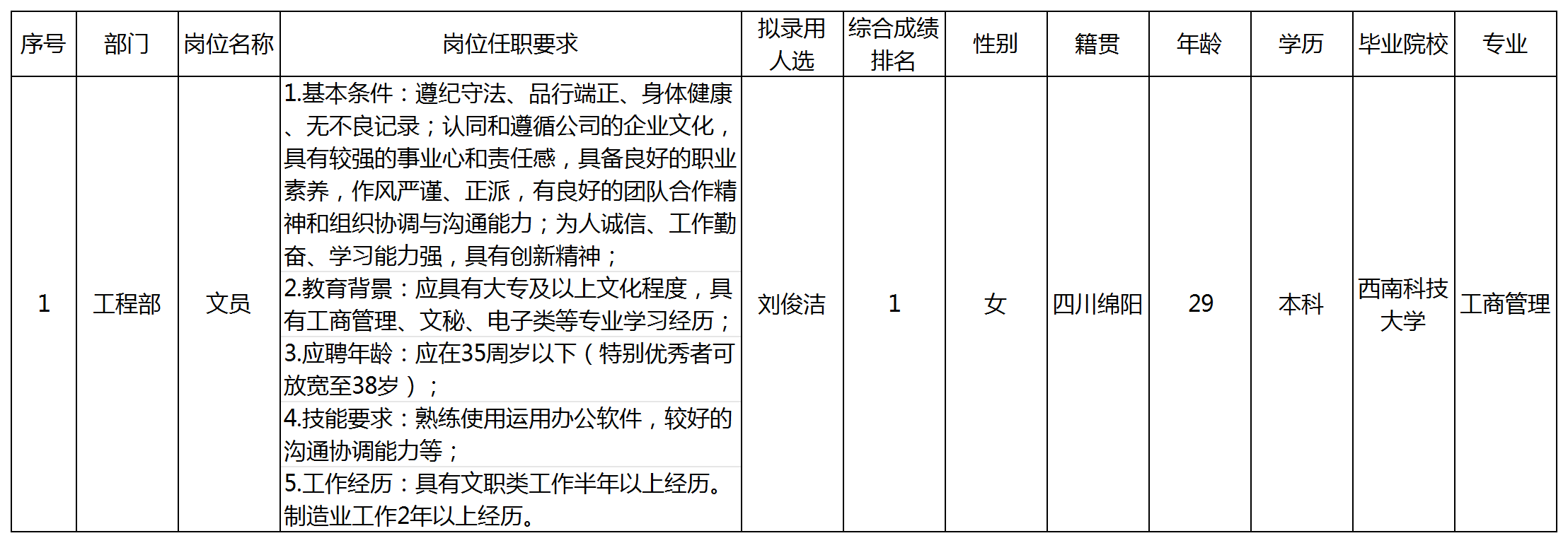 根據(jù)四川九華光子通信技術(shù)有限公司發(fā)布的招聘公告及招聘相關(guān)規(guī)定,經(jīng)面試、考察、體檢等程序,擬錄用劉俊潔同志到四川九華光子通信技術(shù)有限公司工作,現(xiàn)予以公示,具體情況如下: