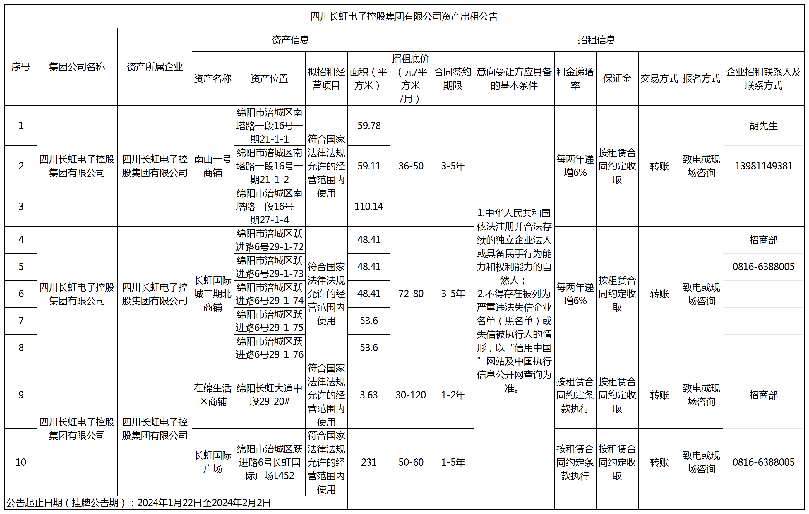 四川長虹電子控股集團有限公司資產(chǎn)出租公告