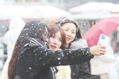 隨著漫天雪花飄落,市民們紛紛拿出手機記錄下眼前美景?!?記者 陳冬冬 攝)