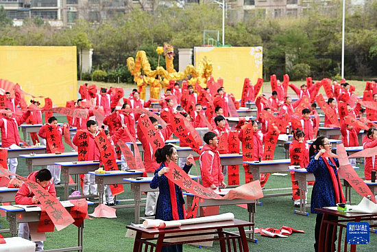 當(dāng)日,江西省贛州市文清路小學(xué)舉行師生集體寫春聯(lián)迎新春活動(dòng),學(xué)校師生在操場(chǎng)上揮毫潑墨,書寫春聯(lián),迎接新春佳節(jié)。