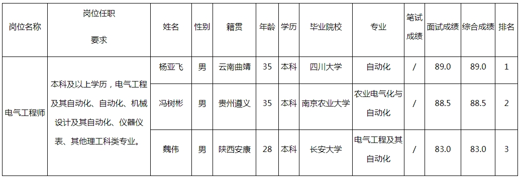 根據(jù)四川波鴻實(shí)業(yè)有限公司發(fā)布的招聘公告及招聘相關(guān)規(guī)定,經(jīng)面試后,現(xiàn)將四川綿陽好圣汽車零部件制造有限公司電氣工程師面試成績予以公示。