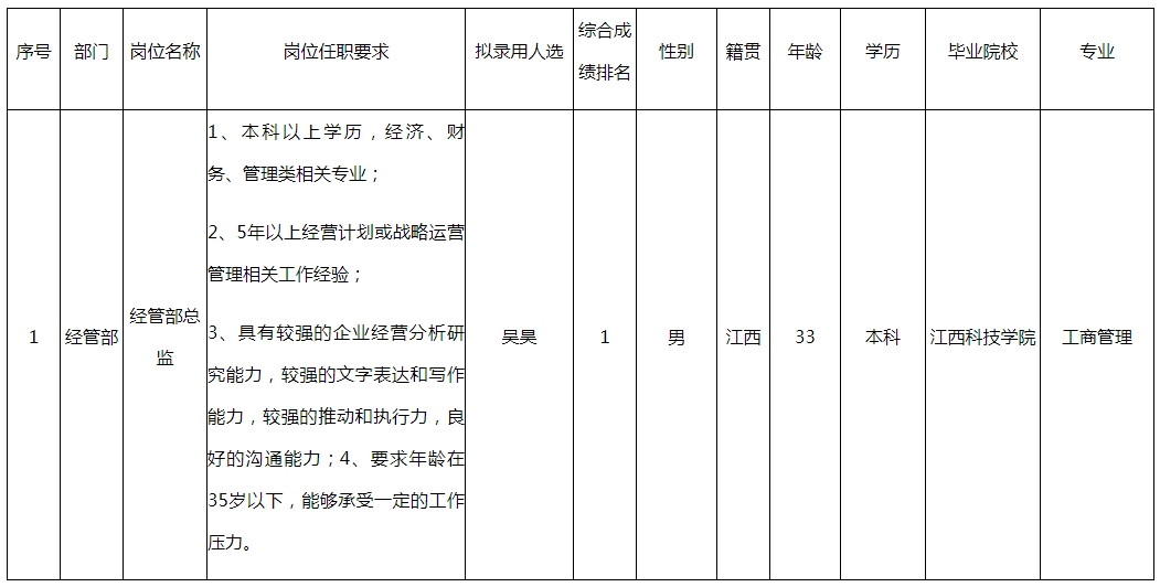 根據(jù)久和新科技(深圳)有限公司發(fā)布的招聘公告及招聘相關(guān)規(guī)定,經(jīng)筆試、面試、考察、體檢等程序,擬錄用吳昊同志到久和新科技(深圳)有限公司工作,現(xiàn)予以公示,具體情況如下:
