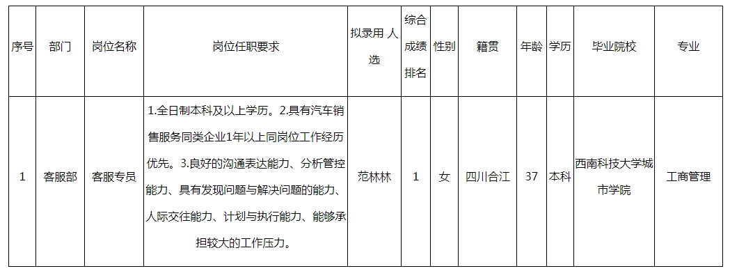 根據(jù)四川波鴻實(shí)業(yè)有限公司發(fā)布的招聘公告及招聘相關(guān)規(guī)定,經(jīng)面試、體檢等程序,擬錄范林林為綿陽市平昌汽車銷售服務(wù)有限公司客服專員,現(xiàn)予以公示,具體情況如下: