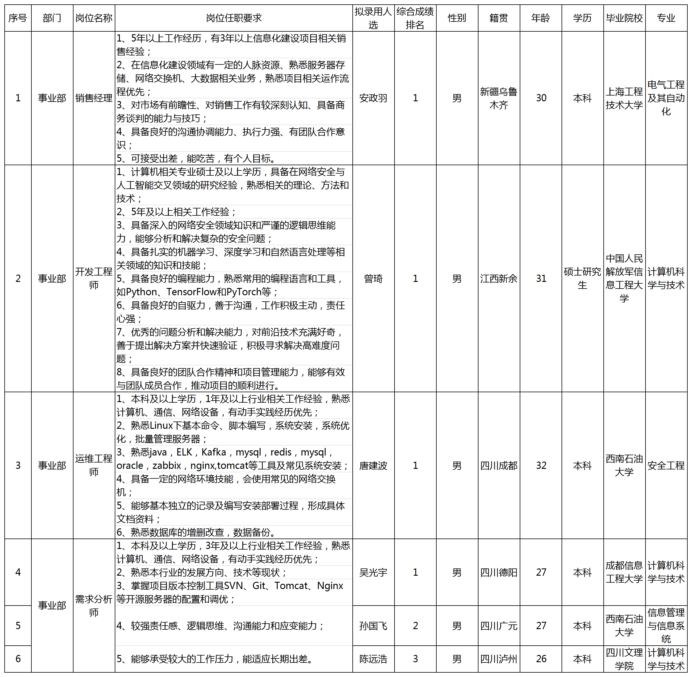 根據(jù)成都九洲電子信息系統(tǒng)股份有限公司發(fā)布的招聘公告及招聘相關(guān)規(guī)定,經(jīng)筆試、面試、考察等程序,擬錄用安政羽等同志到成都九洲電子信息系統(tǒng)股份有限公司工作,現(xiàn)予以公示,具體情況如下: