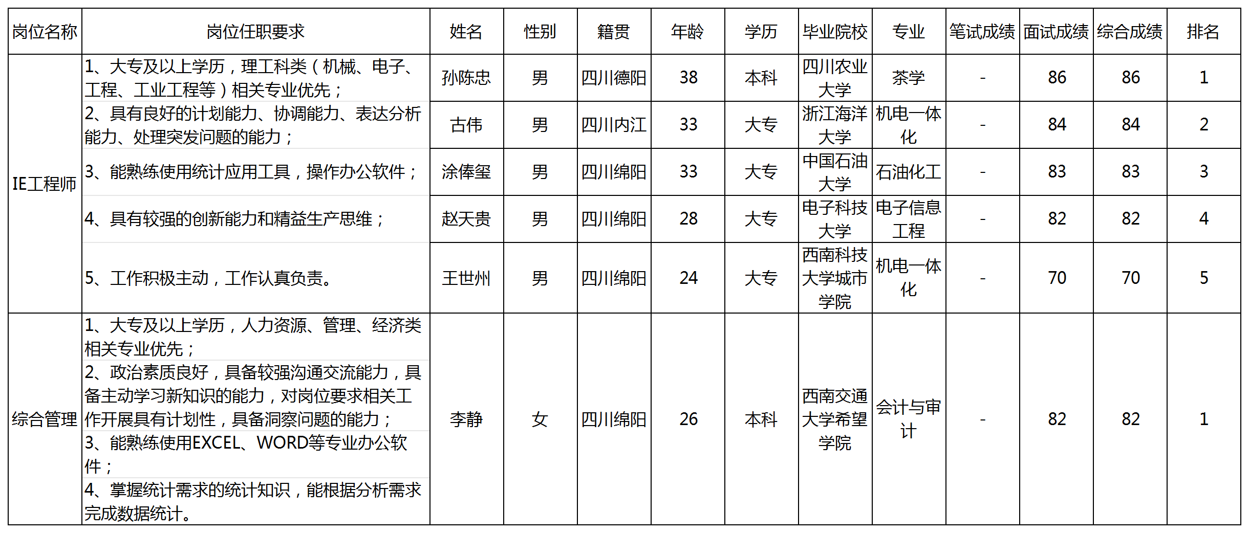 根據(jù)四川九州電子科技股份有限公司發(fā)布的招聘公告及招聘相關(guān)規(guī)定,經(jīng)筆試、面試等程序,現(xiàn)將筆試(面試)成績(jī)予以公示。