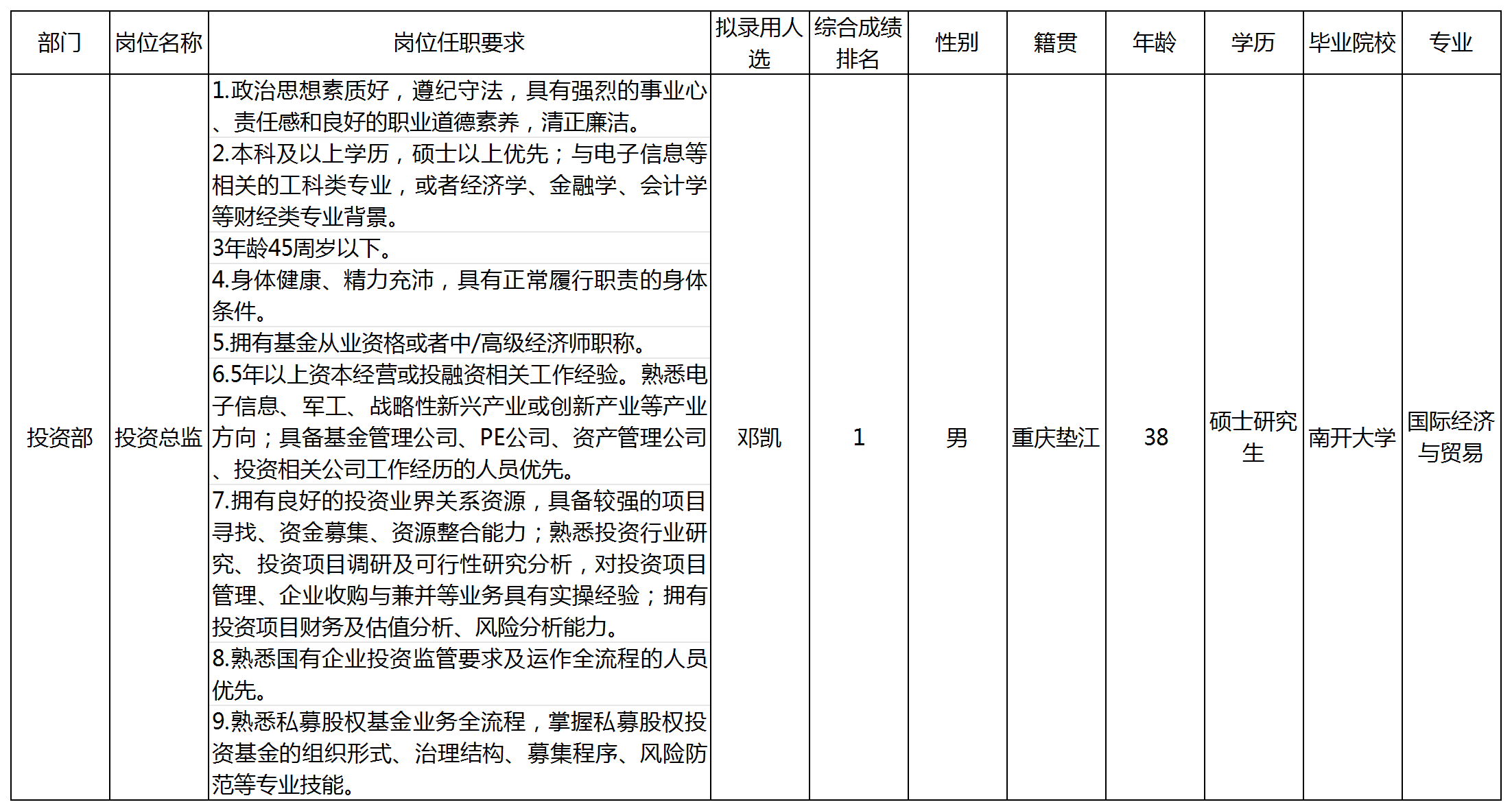 根據(jù)四川九洲創(chuàng)業(yè)投資有限責(zé)任公司發(fā)布的招聘公告及招聘相關(guān)規(guī)定,經(jīng)筆試、面試、考察、體檢等程序,擬錄用鄧凱同志到四川九洲創(chuàng)業(yè)投資有限責(zé)任公司工作,現(xiàn)予以公示,具體情況如下: