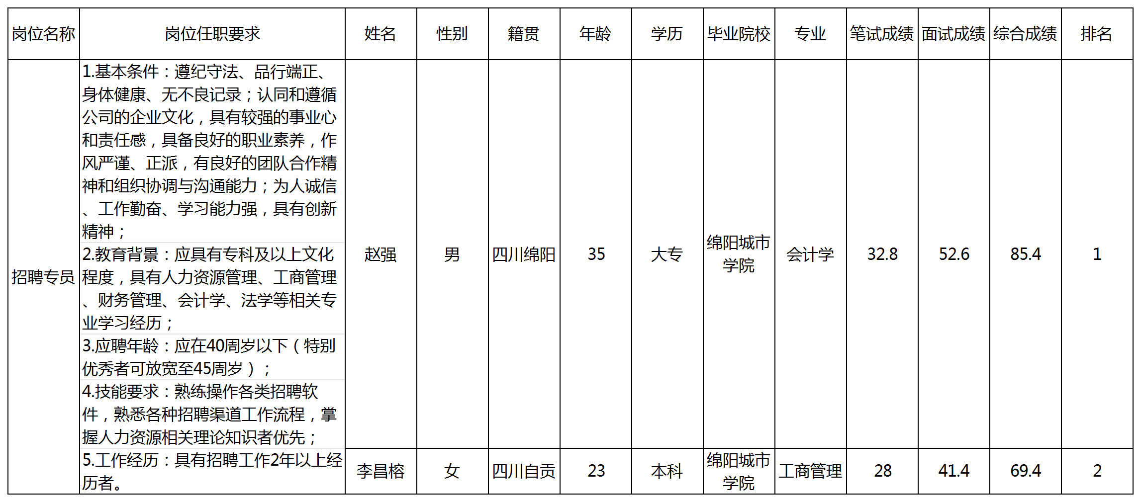 根據(jù)綿陽科技城中科人才服務(wù)有限公司發(fā)布的招聘公告及招聘相關(guān)規(guī)定,經(jīng)筆試、面試等程序,現(xiàn)將筆試(面試)成績予以公示。