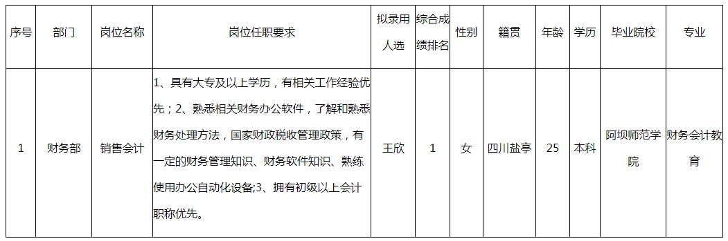 根據(jù)格潤中天公司發(fā)布的招聘公告及招聘相關(guān)規(guī)定,經(jīng)面試、體檢等程序,擬錄用王欣同志到格潤中天財務(wù)部工作,現(xiàn)予以公示,具體情況如下:
