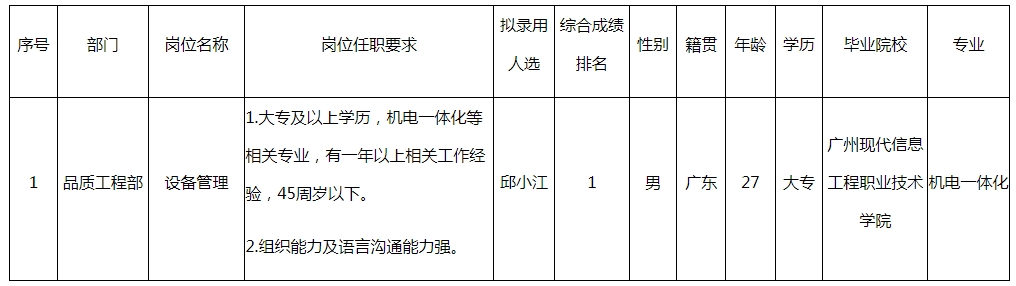 根據(jù)長虹模塑公司發(fā)布的招聘公告及招聘相關(guān)規(guī)定,經(jīng)筆試、面試、考察、體檢等程序,擬錄用邱小江同志到中山長虹模塑科技有限公司任職設(shè)備管理工作,現(xiàn)予以公示,具體情況如下: