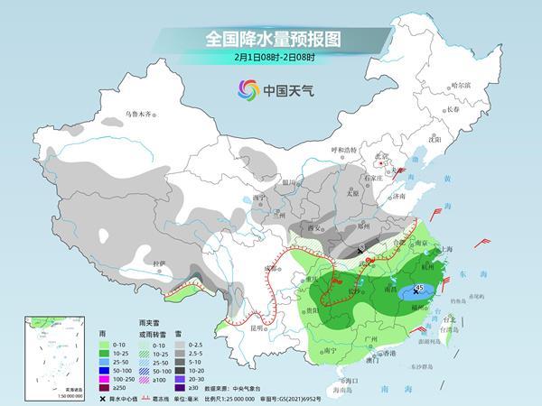明天,內(nèi)蒙古西北部、新疆南部、西藏大部、西北地區(qū)東部、華北南部和西部、黃淮西部等地部分地區(qū)有小雪或雨夾雪,其中,西藏東南部、甘肅南部、陜西中南部、河南南部和西部、安徽北部、湖北北部和西部、云南西北部等地部分地區(qū)有中到大雪(5~8毫米)。江淮大部、江漢東部、江南、西南地區(qū)東部、華南大部等地部分地區(qū)有小到中雨,其中,江西東部、浙江南部、福建北部等地部分地區(qū)有大雨(25~45毫米)。
