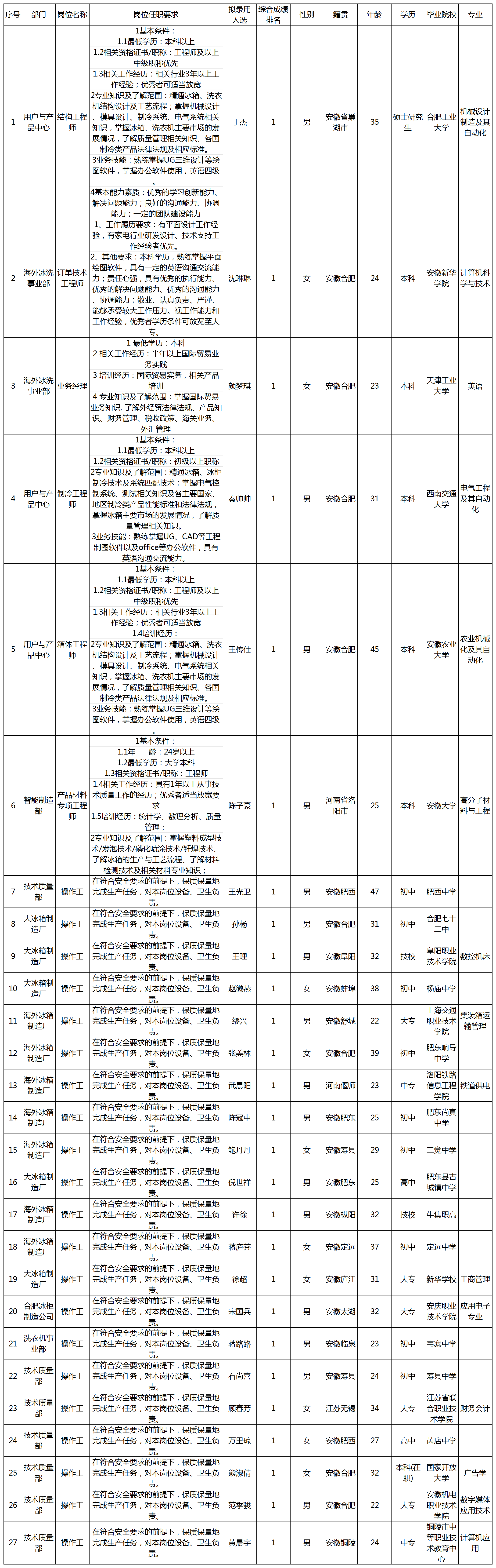 根據(jù)長虹美菱股份有限公司發(fā)布的招聘公告及招聘相關(guān)規(guī)定,經(jīng)面試、體檢等程序,擬錄用丁杰等27名同志到用戶與產(chǎn)品中心等部門工作,現(xiàn)予以公示,具體情況如下: