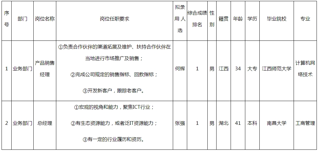 根據(jù)四川長虹佳華信息產(chǎn)品有限責任公司發(fā)布的招聘公告及招聘相關規(guī)定,經(jīng)面試、考察、體檢等程序,擬錄用何輝、張強同志到四川長虹佳華信息產(chǎn)品有限責任公司工作,現(xiàn)予以公示,具體情況如下:
