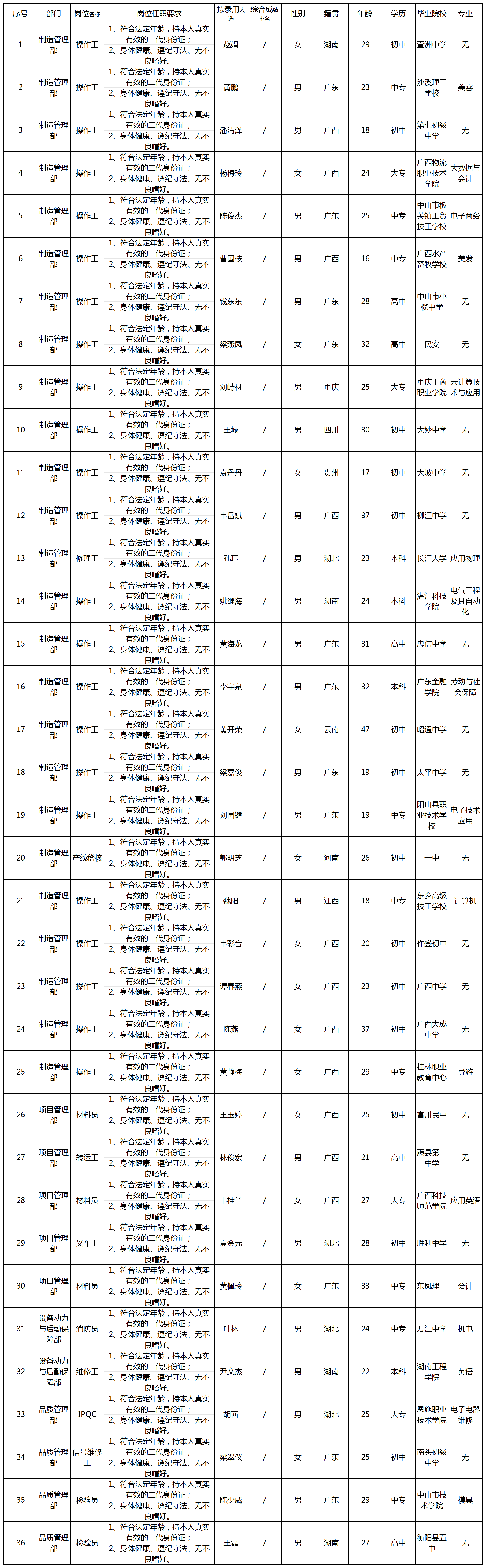 根據廣東長虹電子有限公司發(fā)布的招聘公告及招聘相關規(guī)定,經面試、考察、體檢等程序,擬錄用趙娟等到制造管理部工作;擬錄用王玉婷等到項目管理部工作;擬錄用葉林等到設備動力與后勤保障部工作。擬錄用胡茜等到品質管理部工作?,F(xiàn)予以公示,具體情況如下: