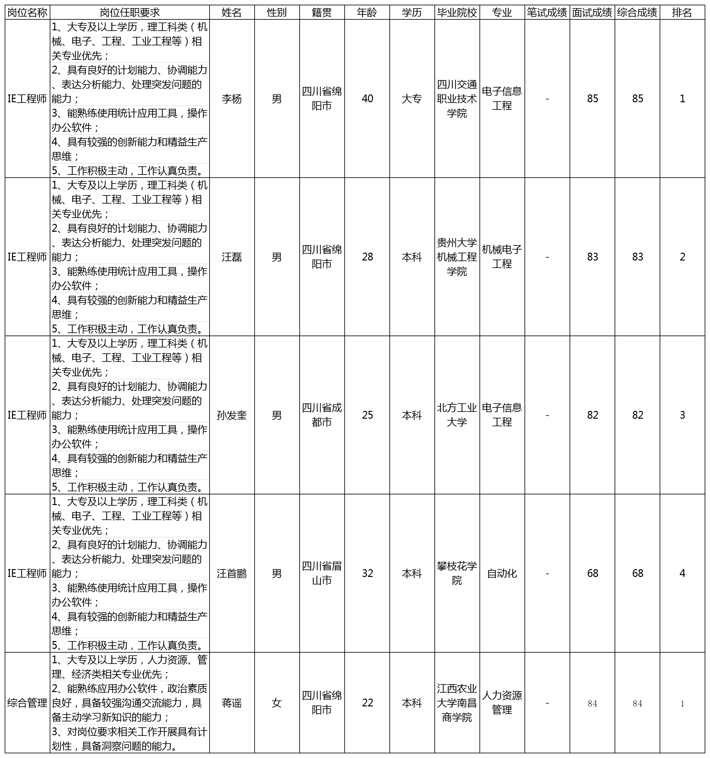 根據(jù)四川九州電子科技股份有限公司發(fā)布的招聘公告及招聘相關(guān)規(guī)定,經(jīng)筆試、面試等程序,現(xiàn)將筆試(面試)成績予以公示。