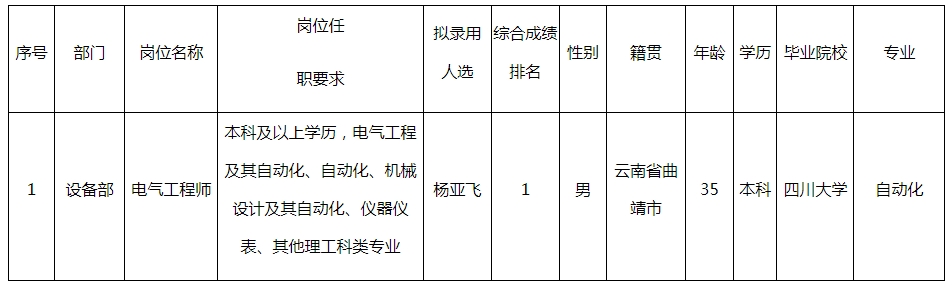 根據(jù)四川波鴻實(shí)業(yè)有限公司發(fā)布的招聘公告及招聘相關(guān)規(guī)定,經(jīng)面試,擬錄用楊亞飛為四川綿陽(yáng)好圣汽車零部件制造有限公司電氣工程師,現(xiàn)予以公示,具體情況如下: