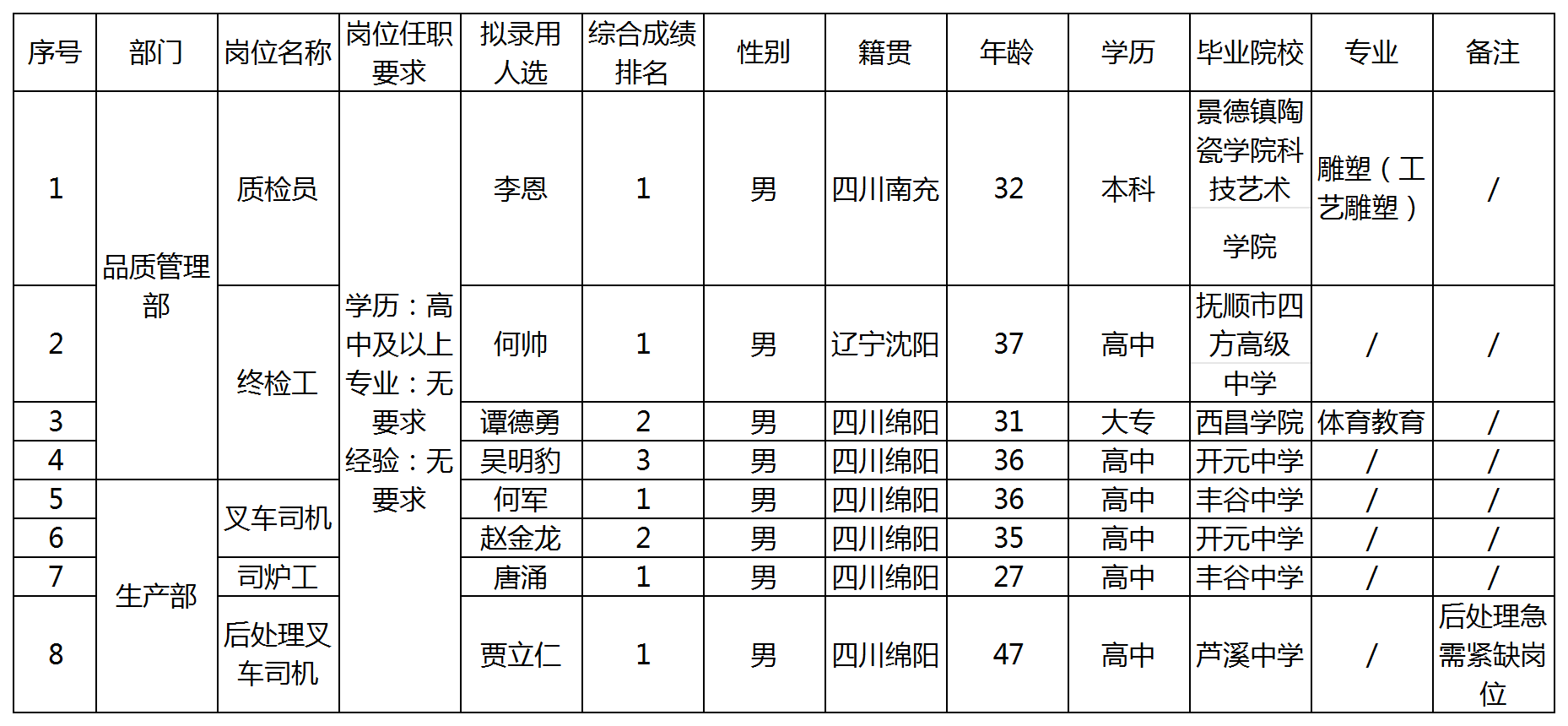 根據(jù)四川波鴻實業(yè)有限公司發(fā)布的招聘公告及招聘相關(guān)規(guī)定,經(jīng)面試,擬錄用以下人員到四川綿陽好圣汽車零部件制造有限公司一線工作,現(xiàn)予以公示,具體情況如下: