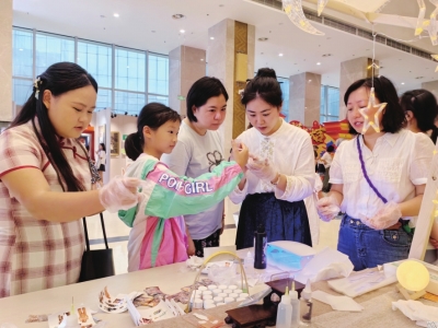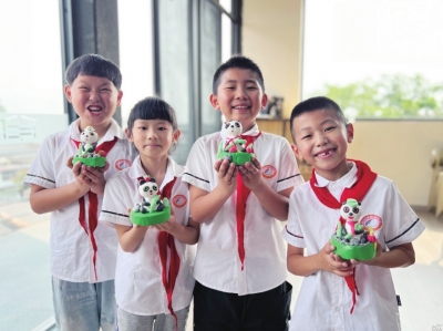 在涪城區(qū)新時代文明實踐中心組織的“喜迎國慶樂享非遺”文明實踐主題活動中,孩子們展示制作的非遺作品?! ?葛楚涵 記者 尹秦 王澤宇攝)