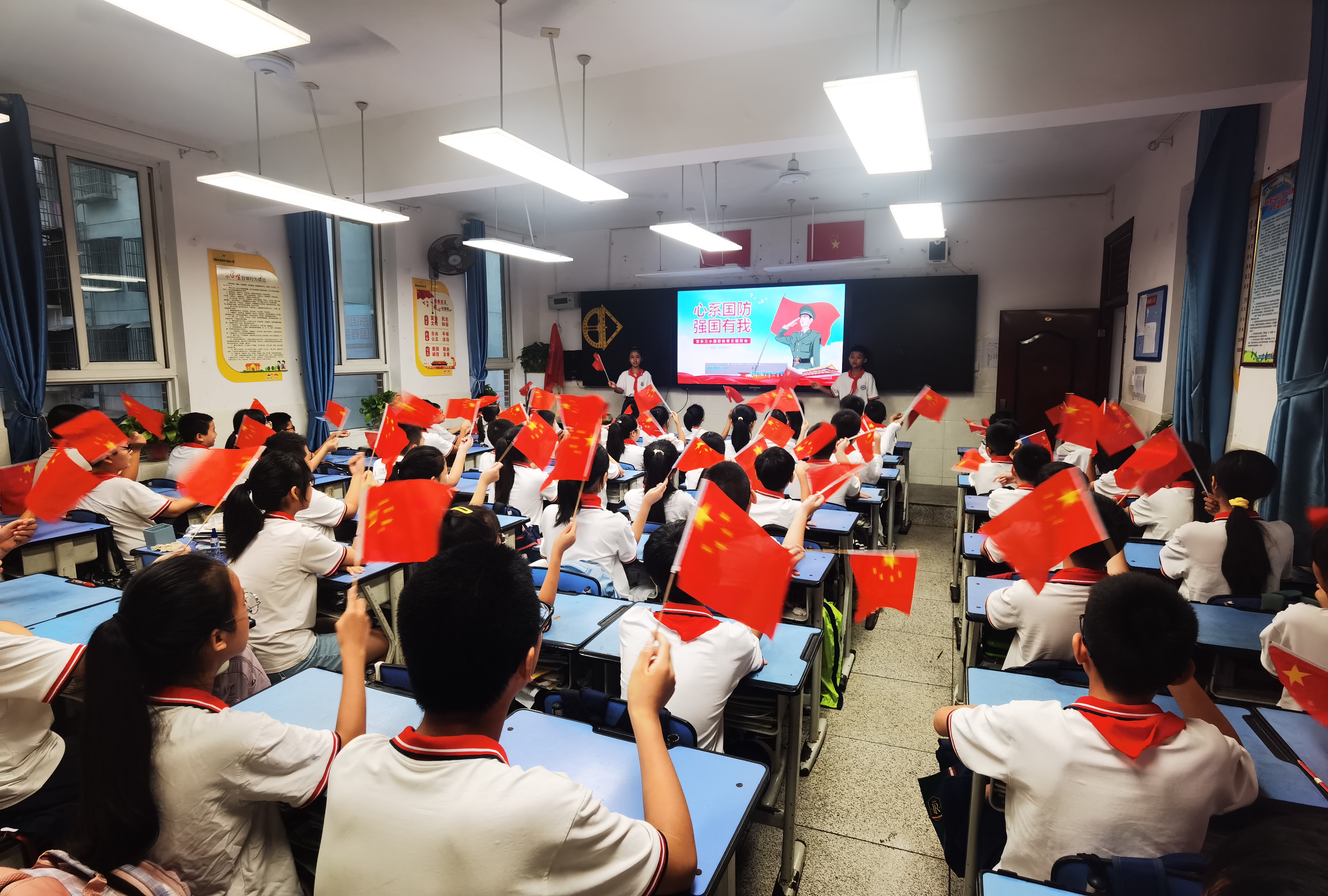 該校政教處統(tǒng)籌安排部署,充分利用黑板報(bào)、班級(jí)懸掛小紅旗等方式,營造節(jié)日氛圍。通過國旗下展示、聽紅色故事、我和國旗合個(gè)影、主題班會(huì)課等形式,迎接這一重要日子。